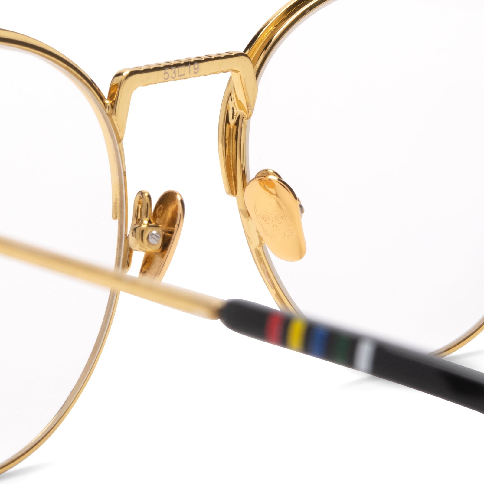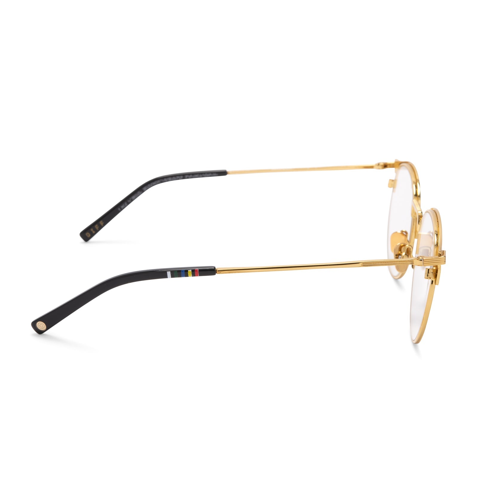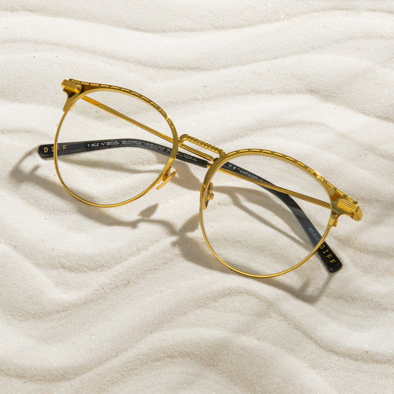Featuring a gold metal frame in medium fit and customizable prescription lenses.