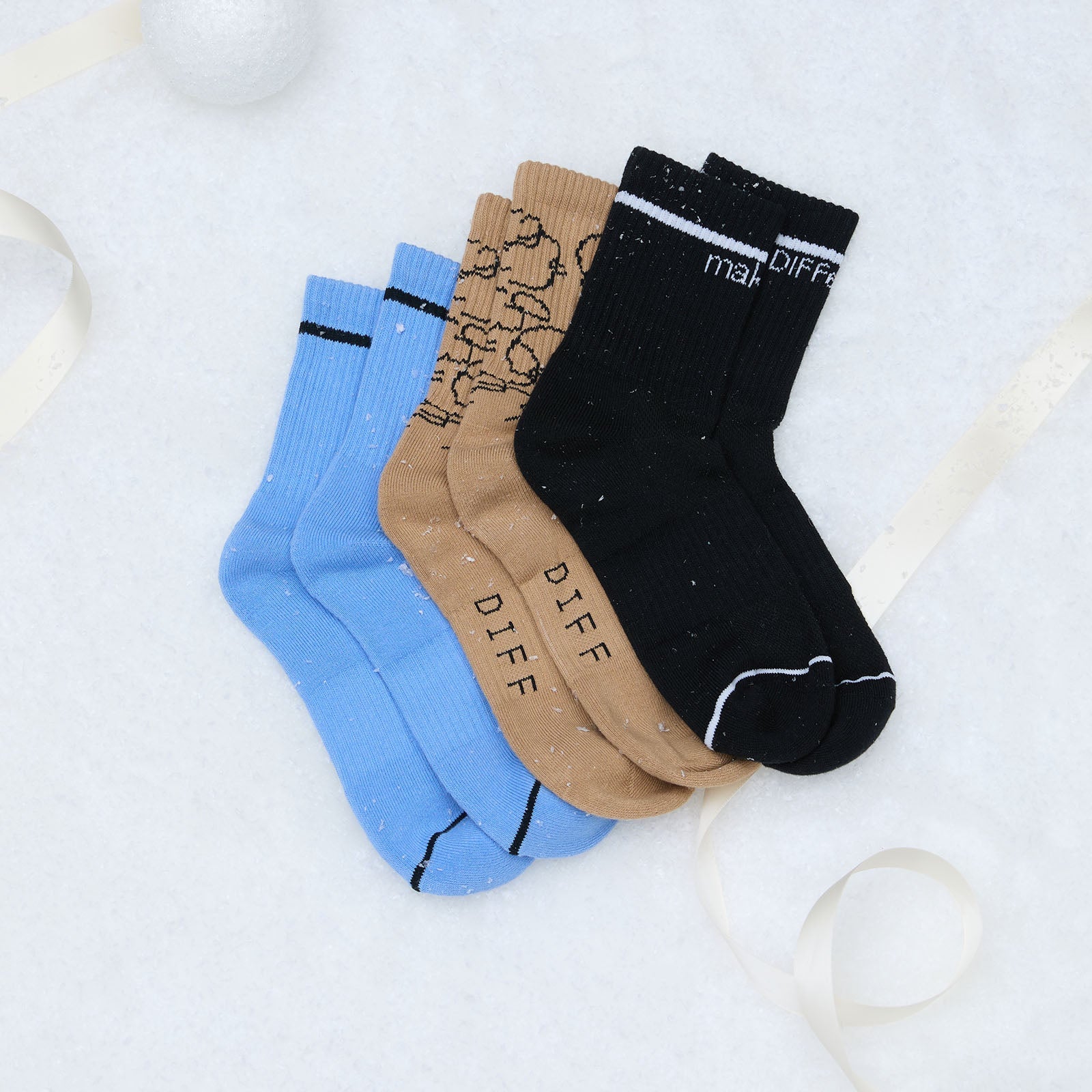 CREW SOCK TRIO - BLACK + SKY BLUE + ABSTRACT CIRCLES