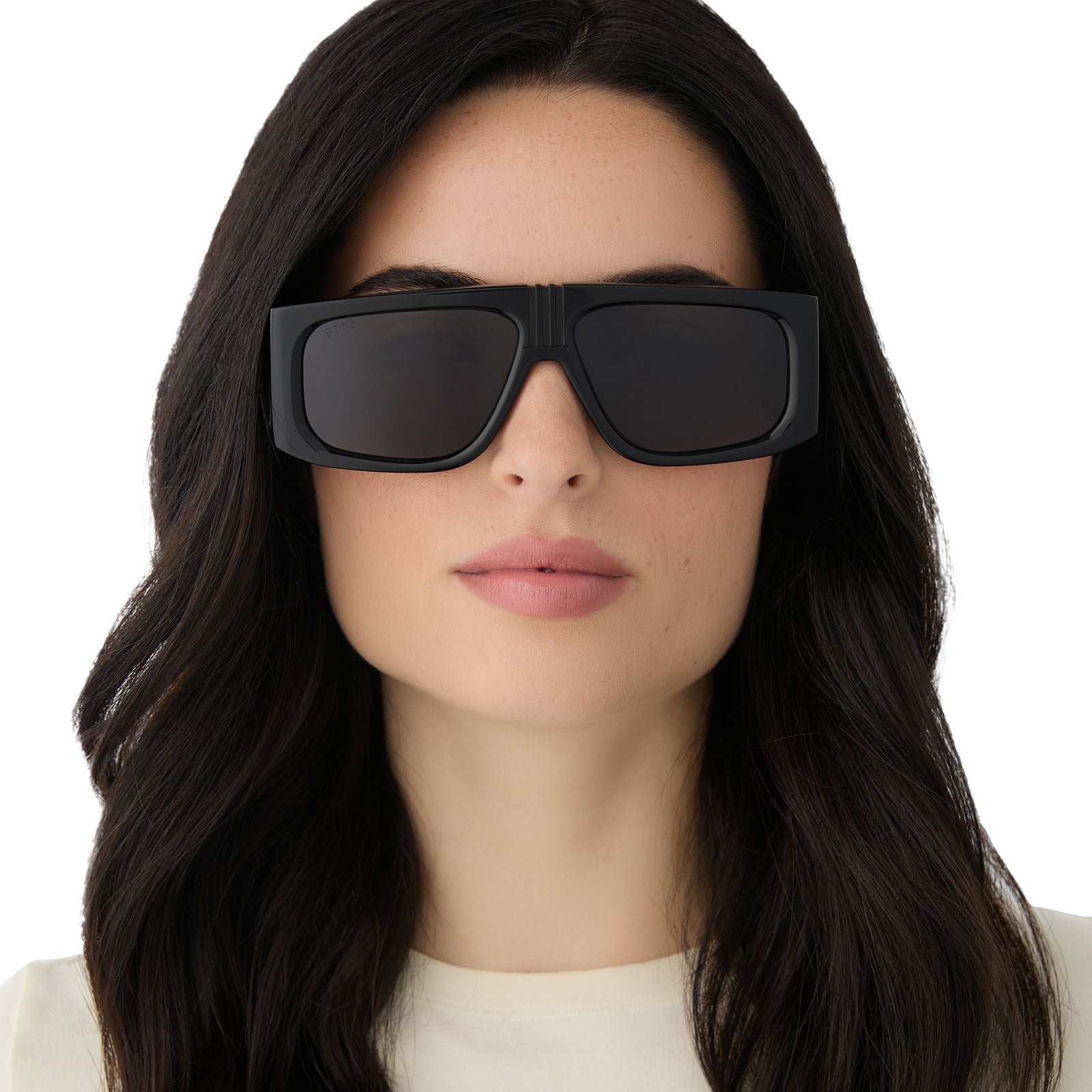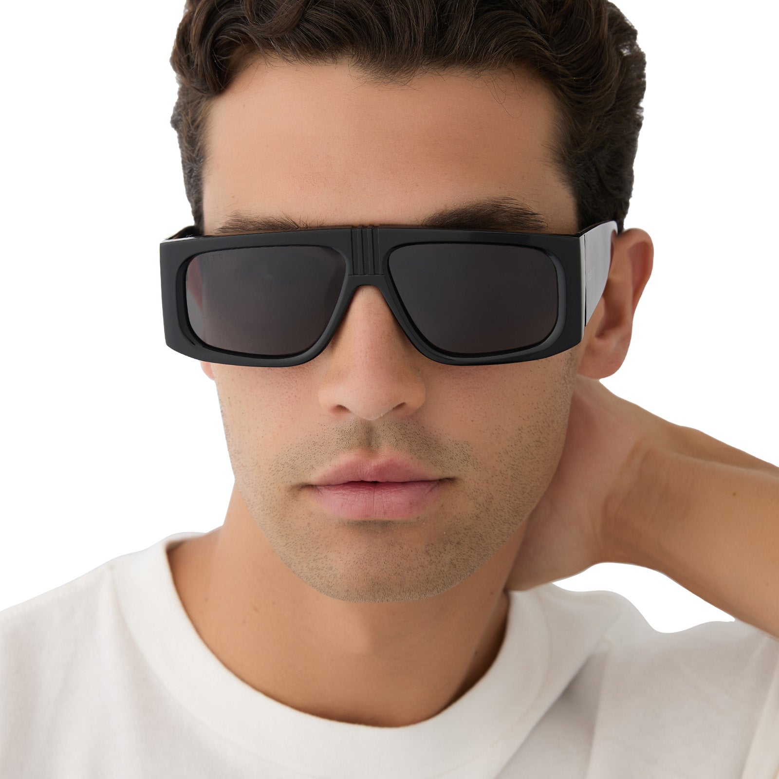 with dark black frames and lenses. Elevated carved acetate evokes the iconic look of Darth Vader's helmet, while the inside of the frames reveals core silver wiring. These shades embody the epic nature of the galaxy's most legendary figure.