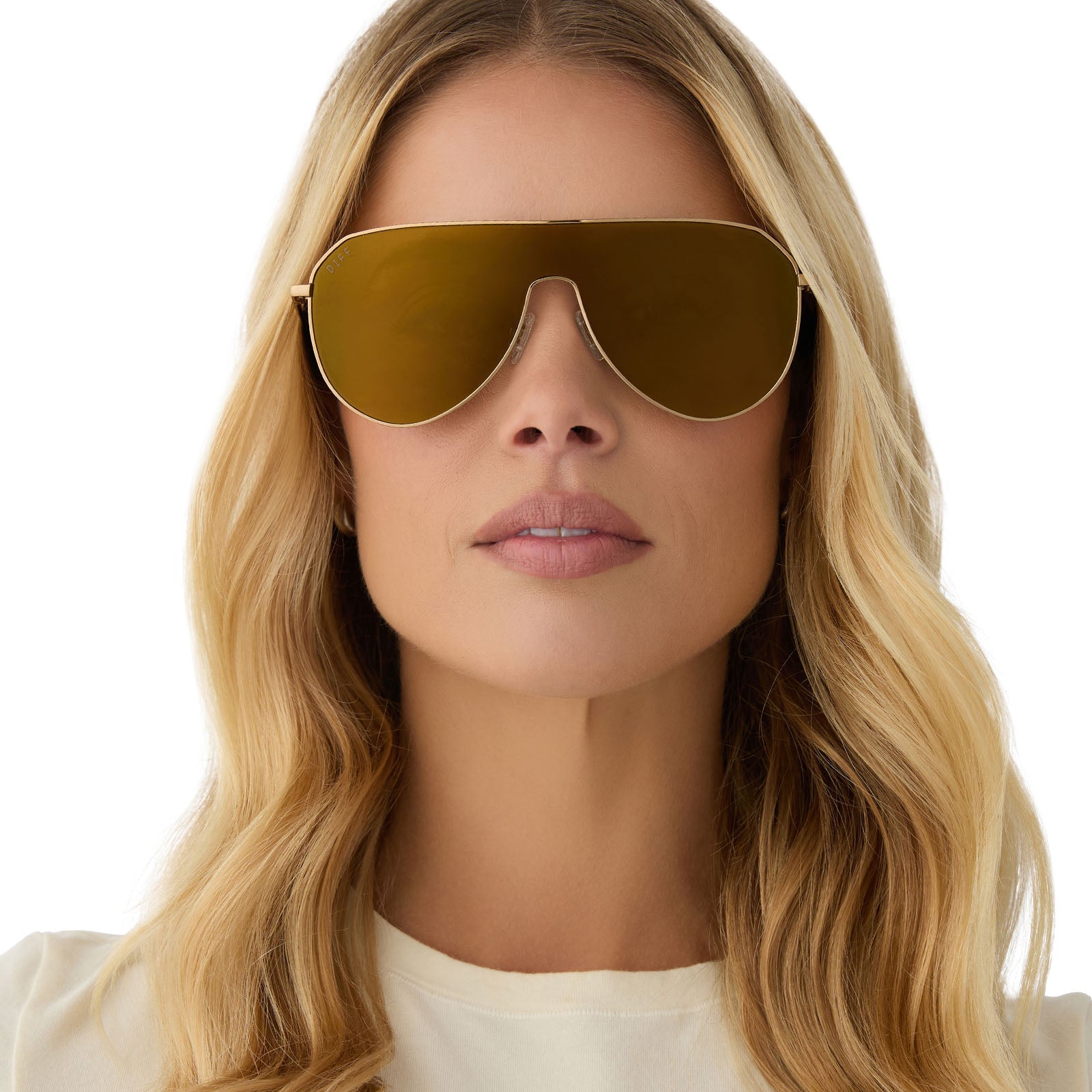 Trendy shield aviators meet the timeless Dash silhouette with reflective lenses and a sleek flat top bar. The classic metal frames and oversized lenses get a modern upgrade with a flat look and epic energy.