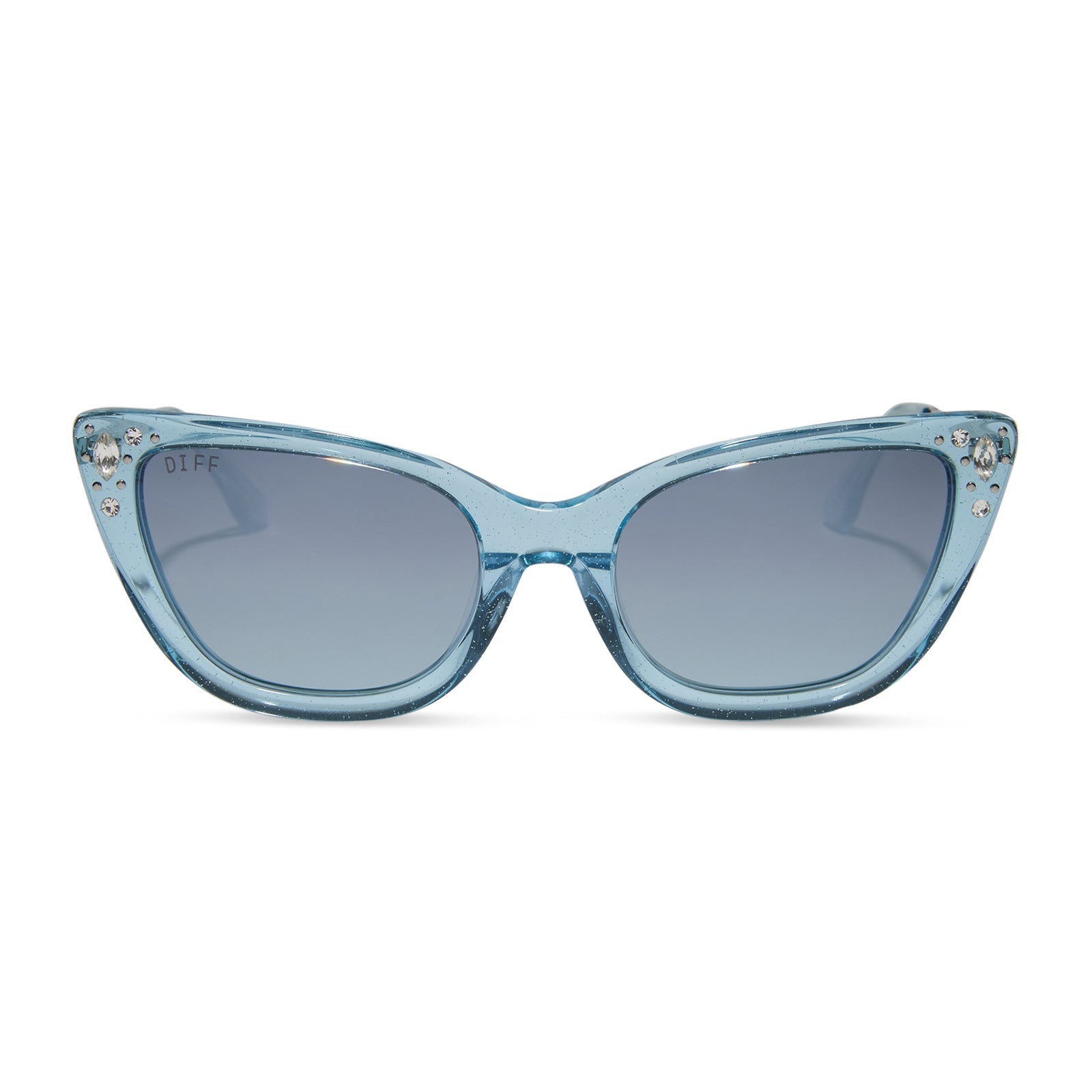 When it comes to classic, confident, and utterly charming style, your wish is granted. These glam cat eye sunnies take color cues from Disney's Cinderella's iconic ball gown with sheer blue crystal glitter acetate frames and blue dust lenses. Clusters of crystal details at the temples and a silver slipper icon are the magical finishing touches.