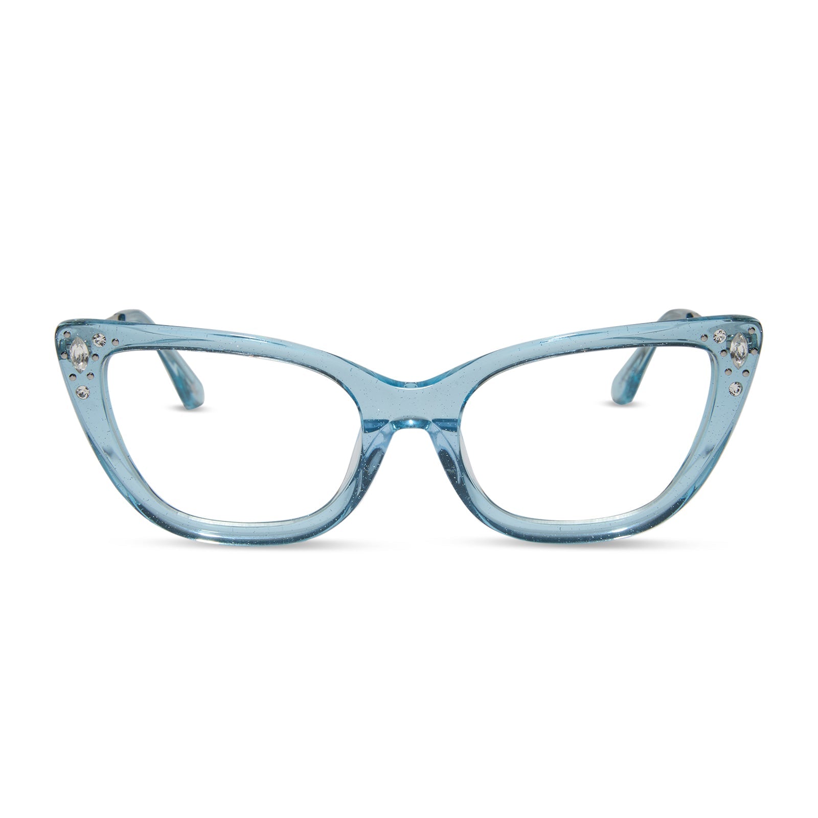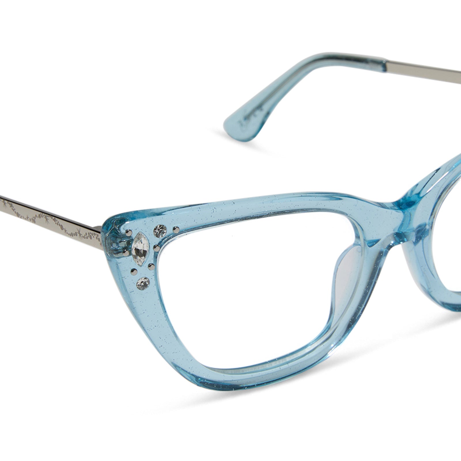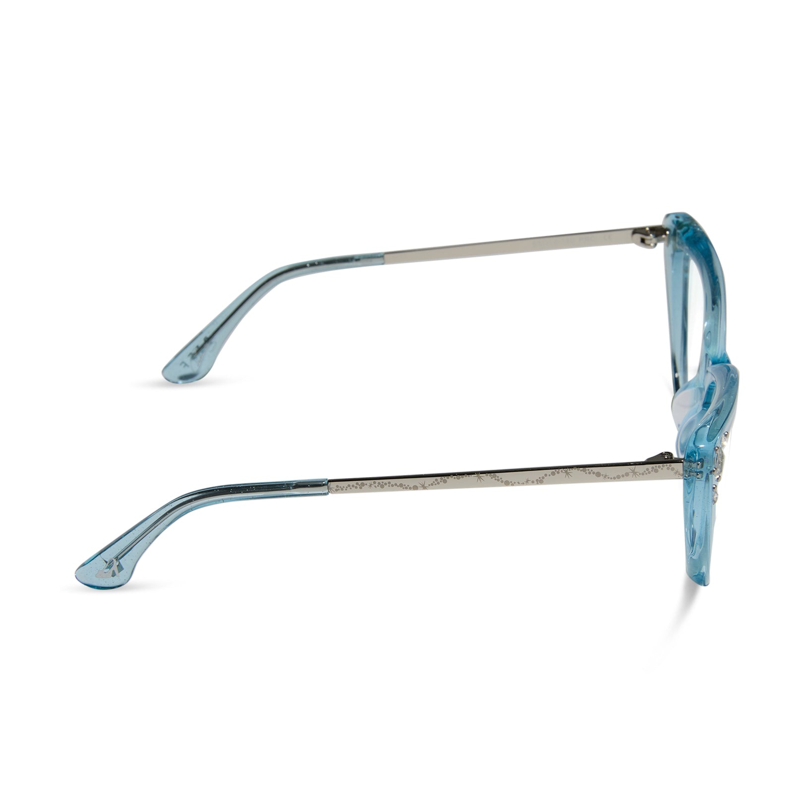 When it comes to classic, confident, and utterly charming style, your wish is granted. These glam cat eye glasses take color cues from Disney's Cinderella's iconic ball gown with sheer blue crystal glitter acetate frames. Clusters of crystal details at the temples and a silver slipper icon are the magical finishing touches.