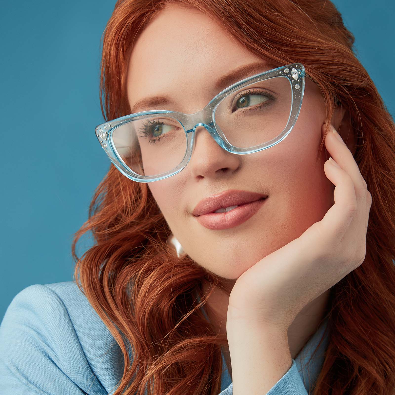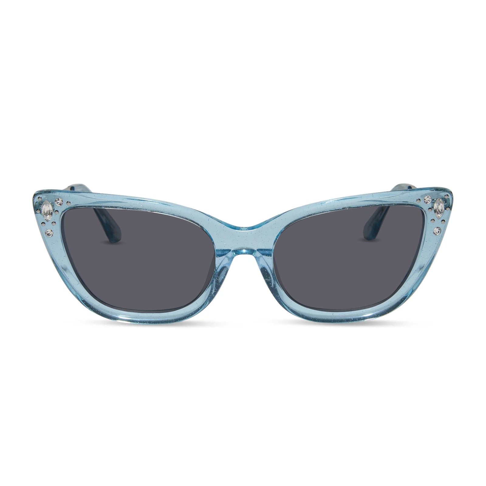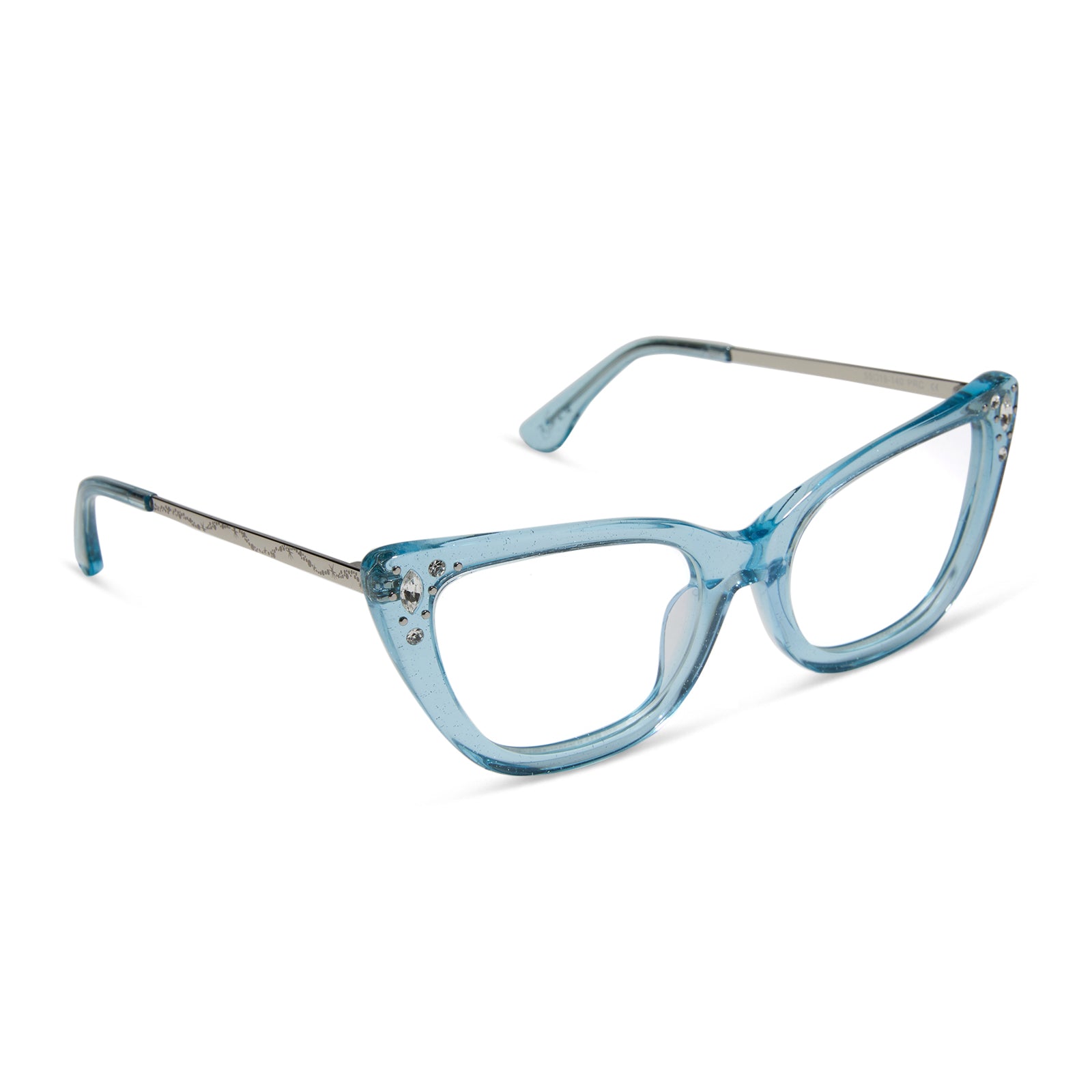 When it comes to classic, confident, and utterly charming style, your wish is granted. These glam cat eye glasses take color cues from Disney's Cinderella's iconic ball gown with sheer blue crystal glitter acetate frames. Clusters of crystal details at the temples and a silver slipper icon are the magical finishing touches.