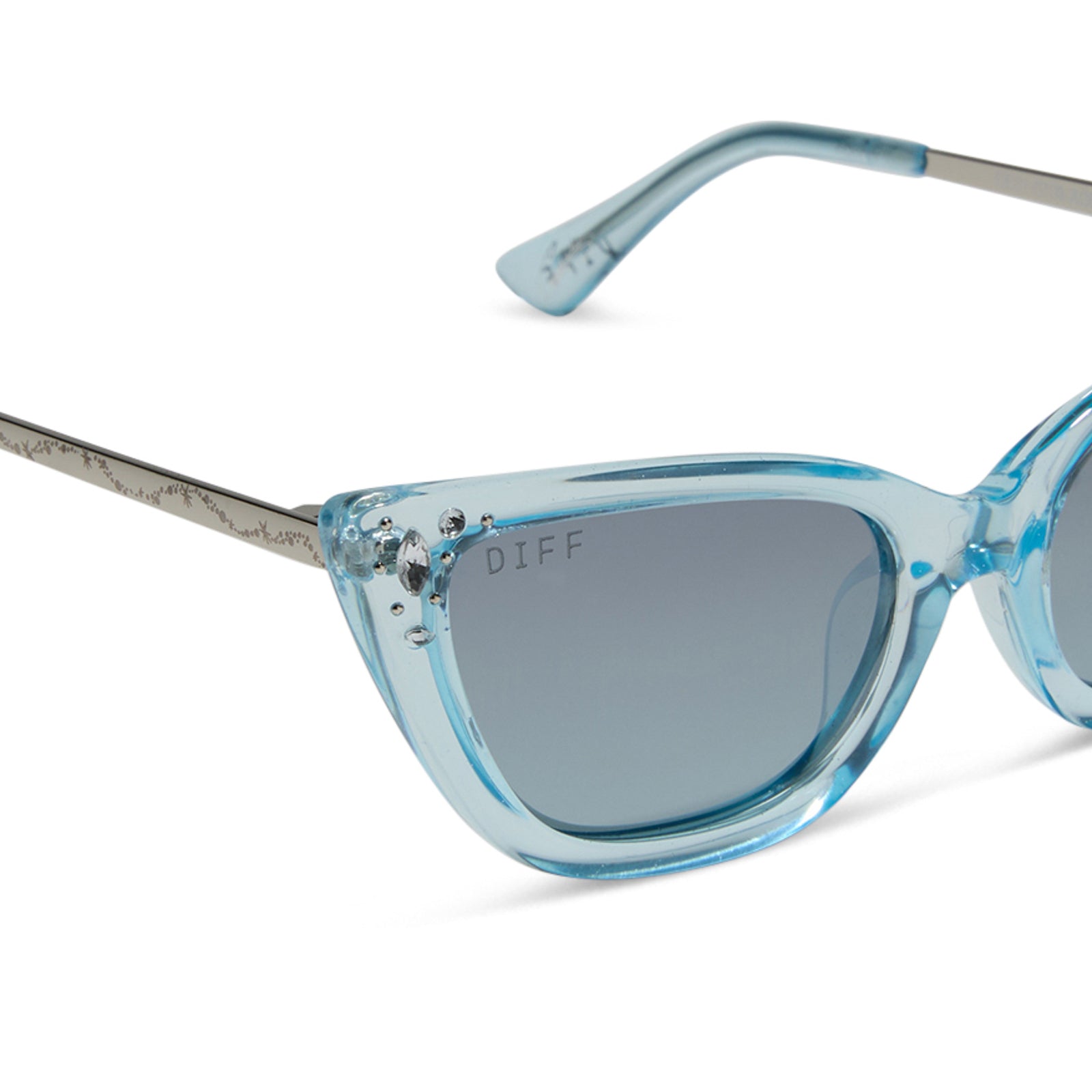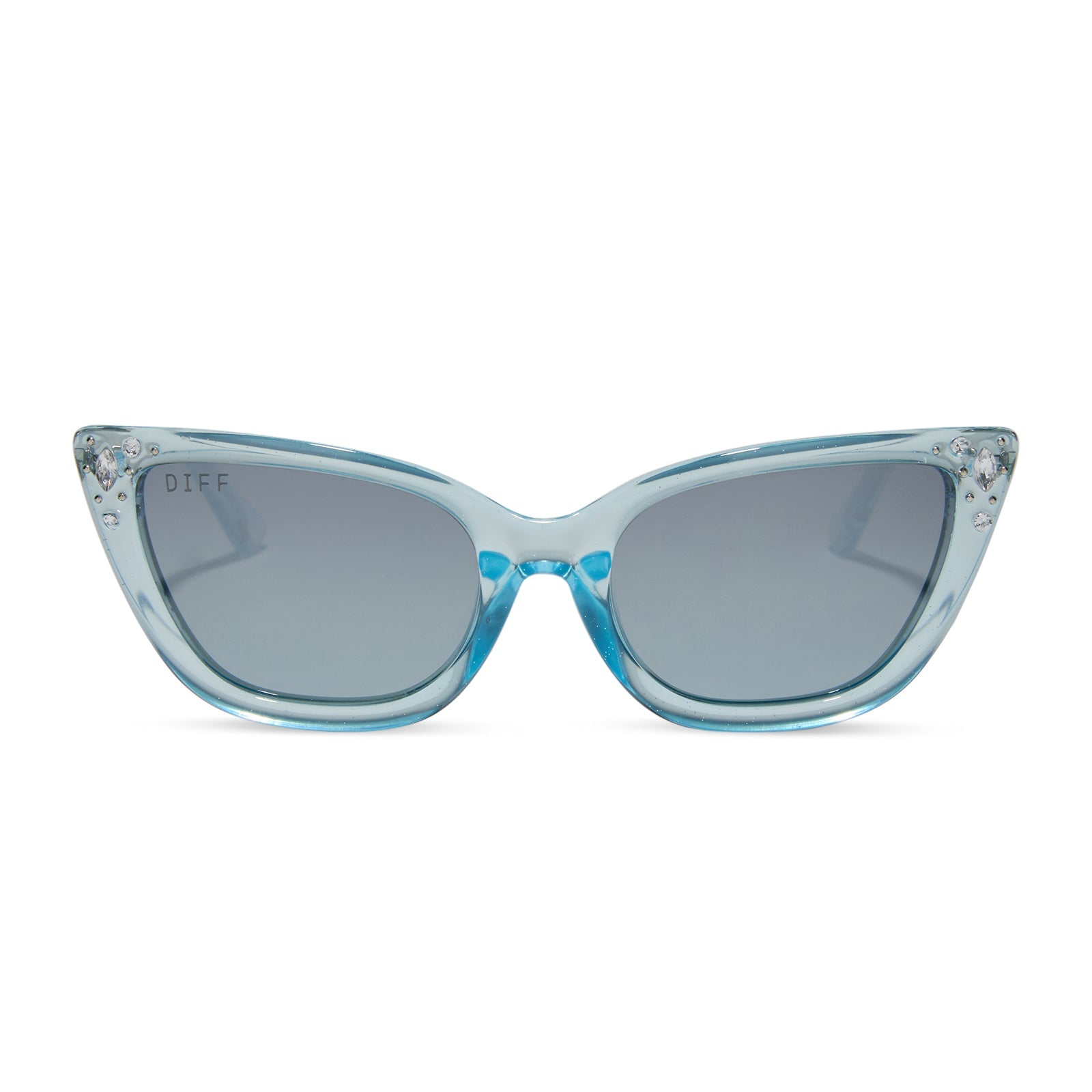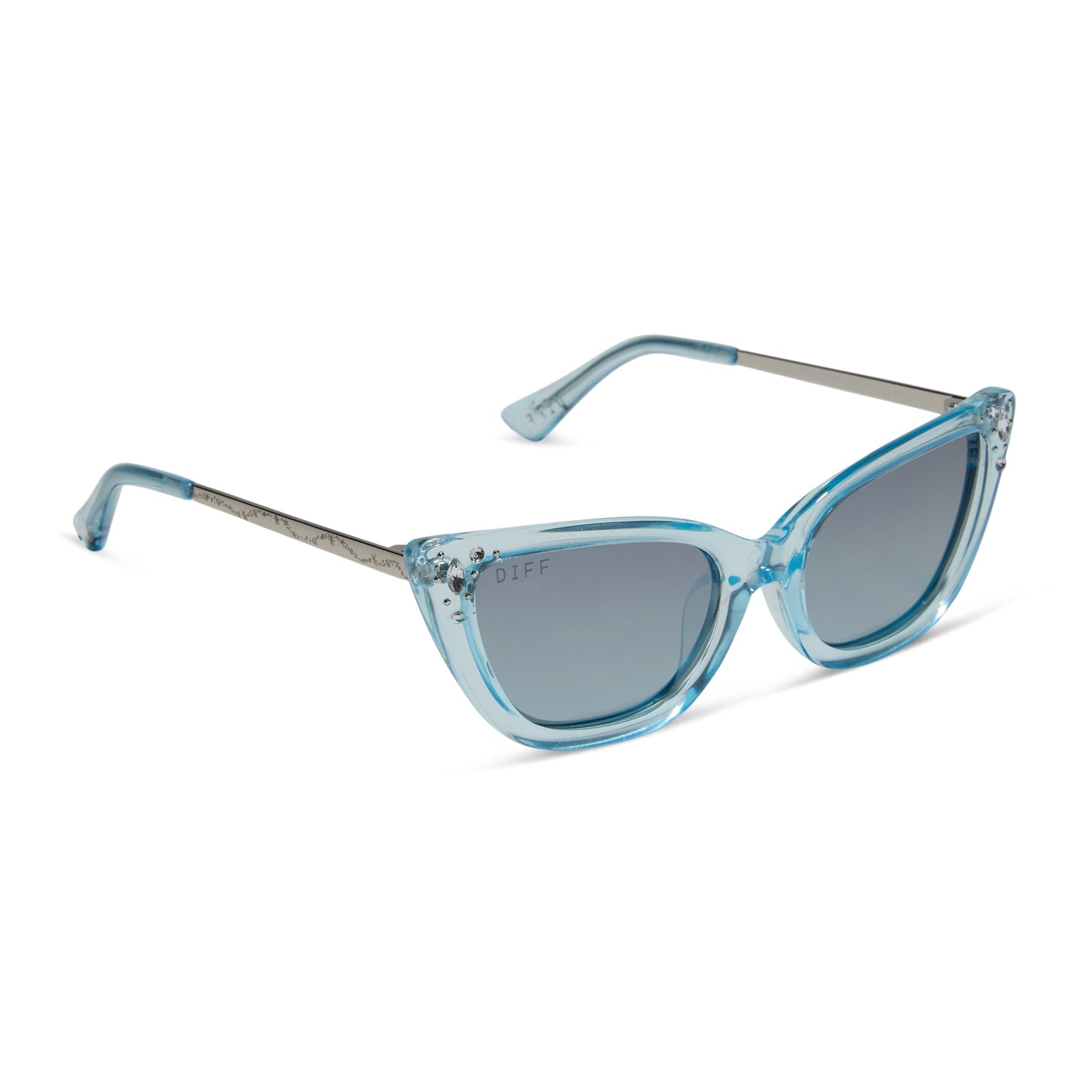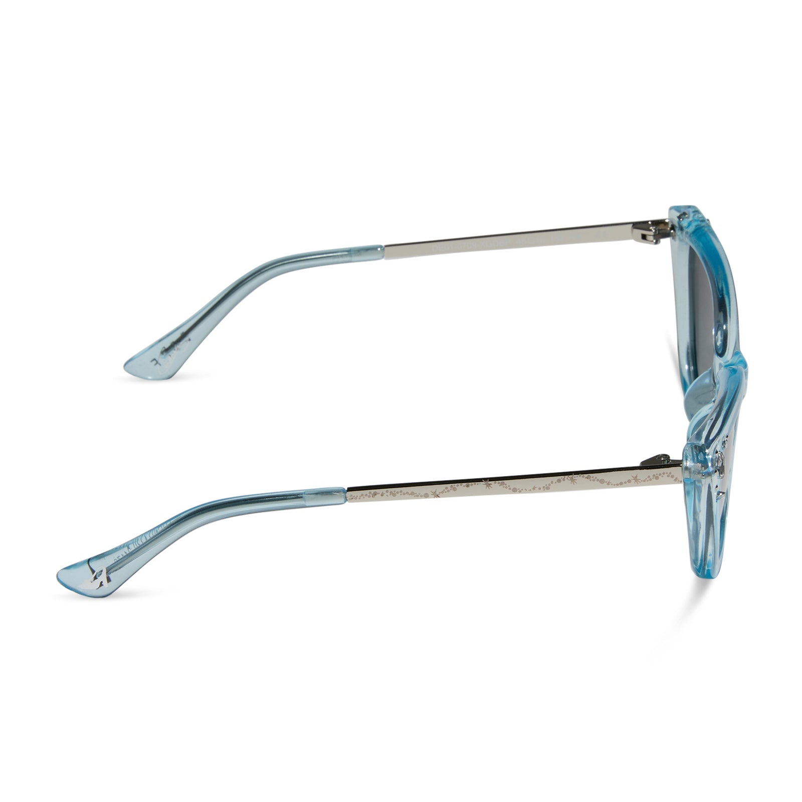 When it comes to classic, confident, and utterly charming style, your wish is granted. These glam cat eye sunnies take color cues from Disney's Cinderella's iconic ball gown with sheer blue crystal glitter acetate frames and blue dust lenses. Clusters of crystal details at the temples and a silver slipper icon are the magical finishing touches.