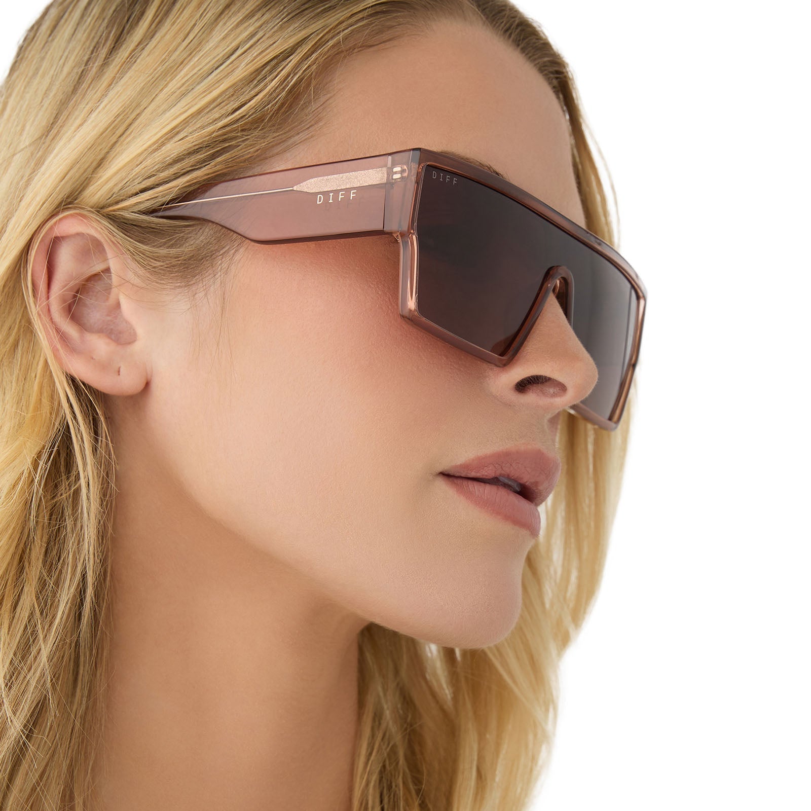 We're making a statement - and a stylish one. It's all eyes on Electra, with her glam futurism. The thick shield-style sunnies pair expertly with a flat top and wide arms for instant eyewear envy.