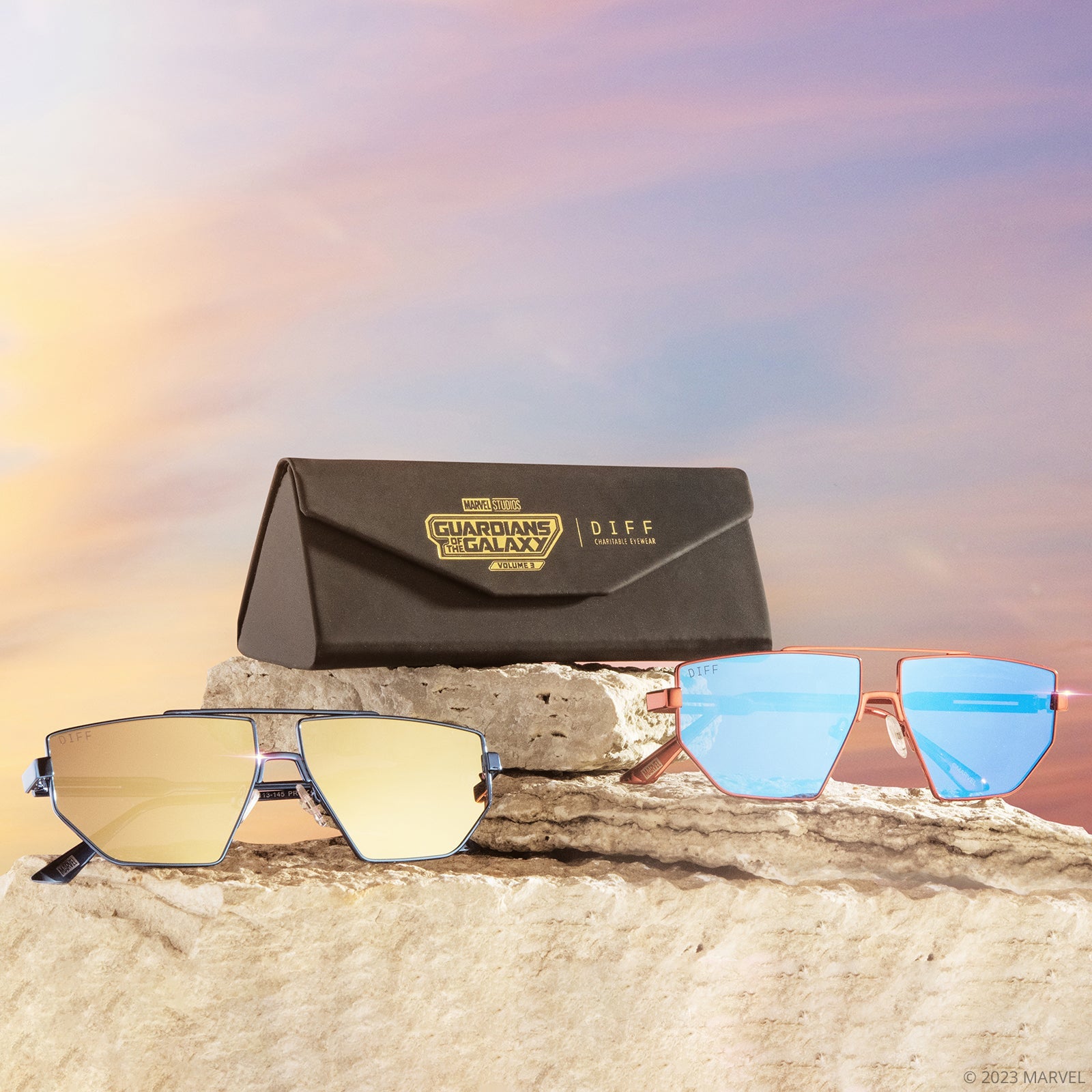 Modern angular aviators reach new levels of style with Marvel Studios’ Guardians of the Galaxy: Vol. 3 Galactic Heroes. Iconic metallic details and sleek, flat lenses create a timelessly cool style, on Earth or across the galaxy. © 2023 MARVEL