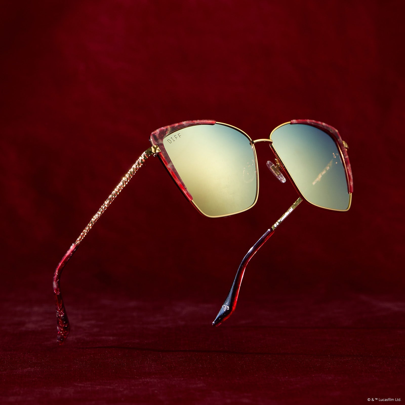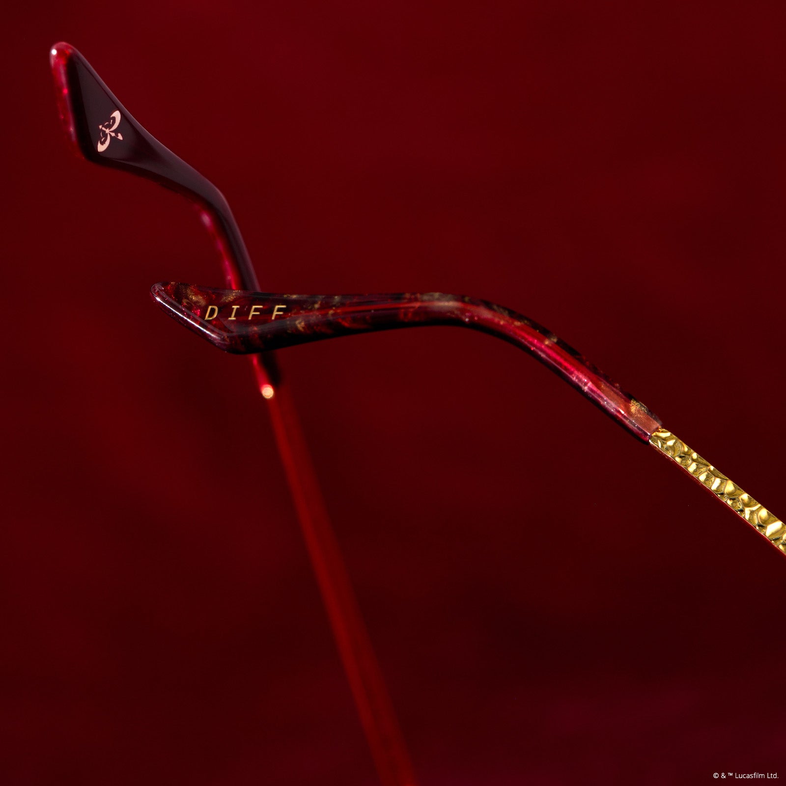 There's not mistaking these frames for a handmaiden's with their rich gold metals and sophisticated reds, featuring marbling that evokes the royal palace of Naboo™️ as well as a hidden Naboo sigil.
